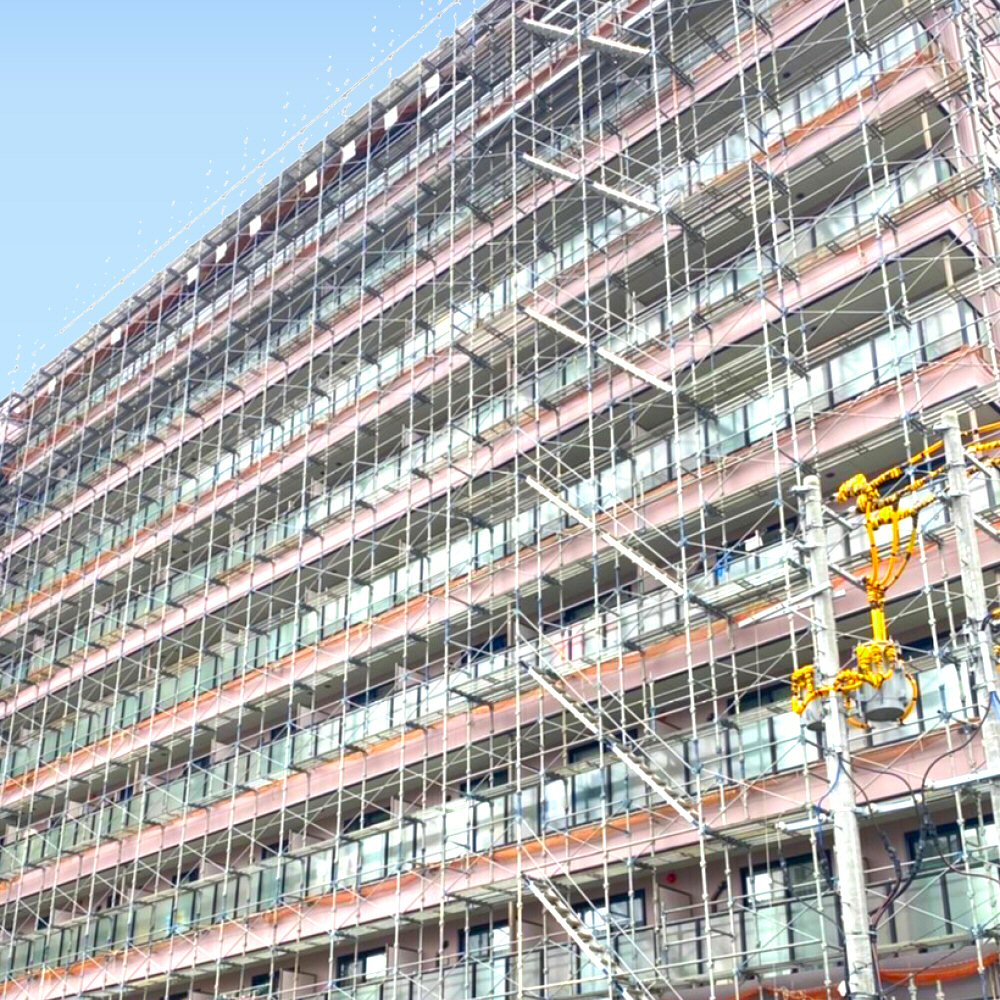 枠組足場とは、鋼管を門型に溶接された建枠にジャッキベース・筋交・鋼製布板などの部材を組み合わせて、積み上げて構成する仮設足場です。